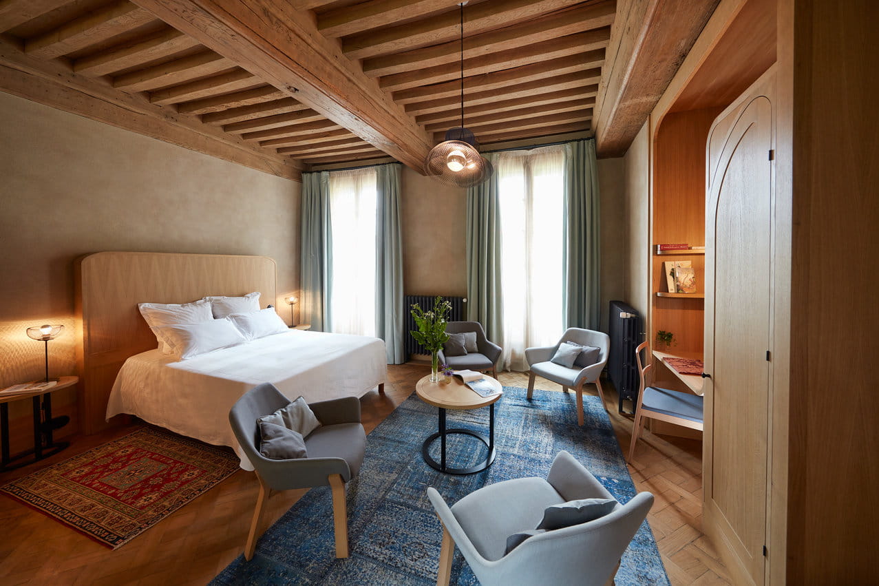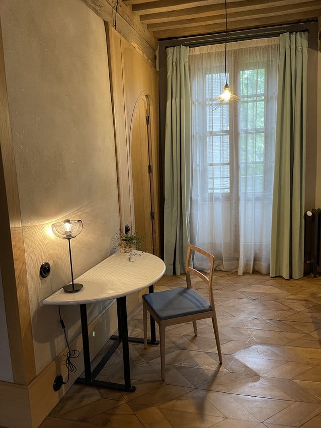 Leur réhabilitation fait la part belle au chêne brut du Morvan avec un mobilier majoritairement intégré. Tout a été fabriqué sur mesure par des artisans locaux, en témoignent les tables demi-lune en céramique faites dans une ancienne fabrique d'assiettes à quelques kilomètres.