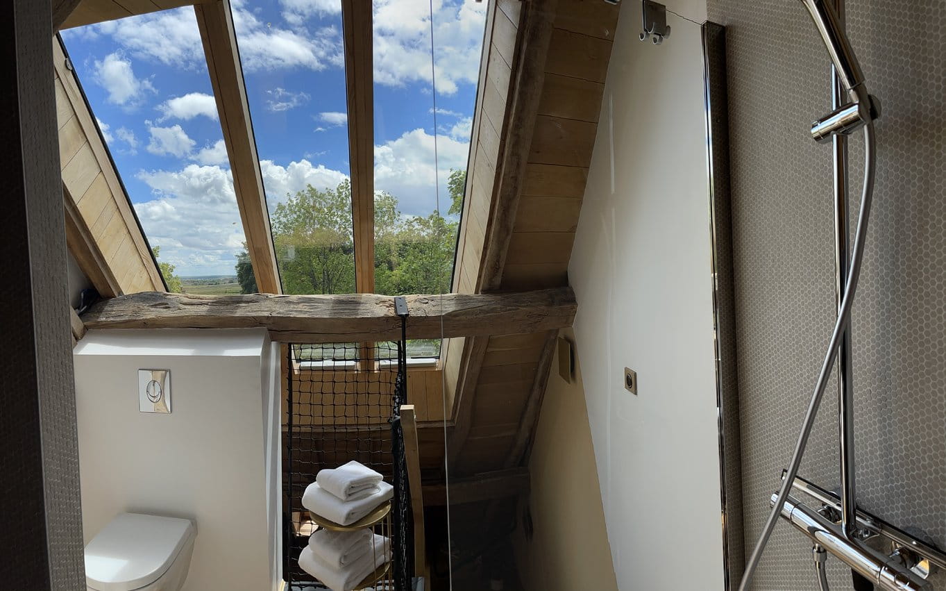 - Bathroom open to the bedroom, with shower and WC, located on the mezzanine, and accessible by stairs from the sleeping area.