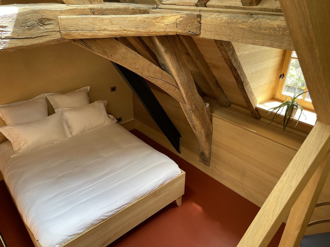 Between a traditional wooden frame and reinforcing metal porticos, the project includes the thermal rehabilitation of the envelope and the development of four bedrooms and their bathrooms on the mezzanine, perched in contact with the farms.