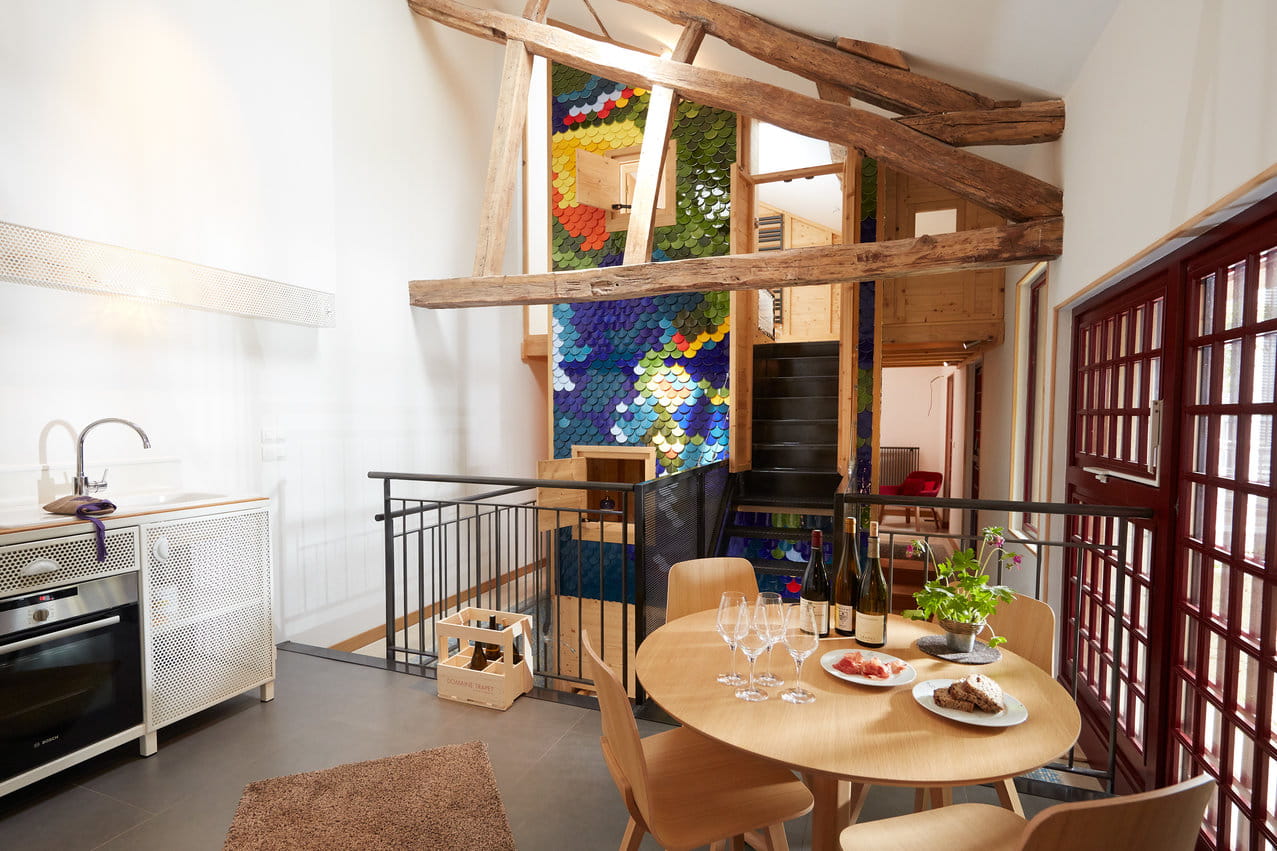 . Located in the Domaine Trapet guest house in the center of Gevrey-Chambertin, the building which contained an indoor swimming pool, uses the volume emptied of its water to house a carved wooden tower. This shelters, over a surface area of twelve square meters and three levels, six beds thanks to a clever play of nestings.